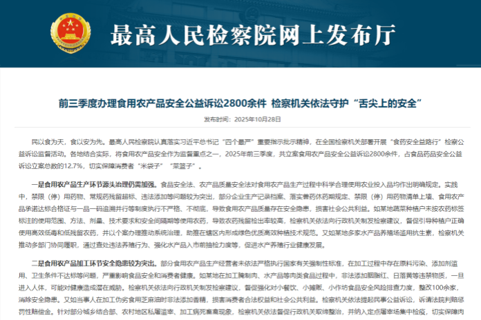• 前三季度檢察機關立案食用農產品安全公益訴訟2800余件